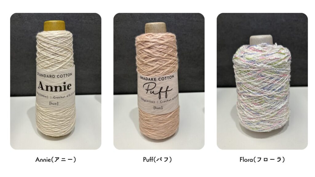 なんといっても、この3つの糸の組み合わせがお気に入りです!きなり色のAnnieで編む「交差編み」は、模様がぷっくりと立体的で、編んでいてとても楽しいです。そこにFloraのアクセントで自分だけの特別な道具という感じがして、作業の合間に眺めてはワクワクしています。