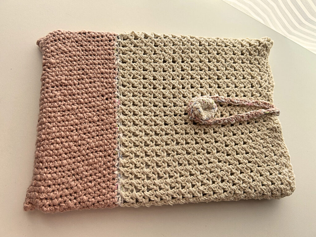 完成したケースにMacBookを入れてみたところ、毛糸の境目部分に少しきつさを感じましたが、本体にはぴったりフィットしました!下段の細編み部分と上段の交差編みの部分で、毛糸の感触もそれぞれ違って癖になります。春らしいケースができて、とても満足しています。